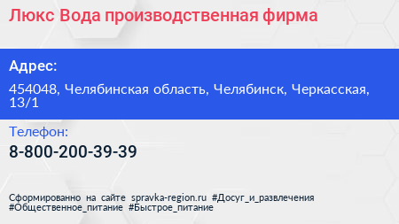 Люкс Вода, производственная фирма по адресу 454048, Челябинская область, Челябинск, Черкасская, 13/1 в дальнейшем Организация, размещена в следующих категориях: