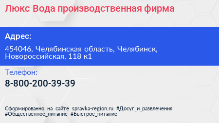Люкс Вода, производственная фирма по адресу 454046, Челябинская область, Челябинск, Новороссийская, 118 к1 в дальнейшем Организация, размещена в следующих категориях: