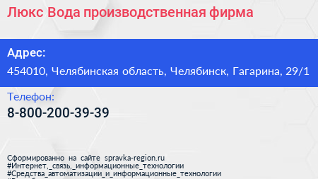 Люкс Вода, производственная фирма по адресу 454010, Челябинская область, Челябинск, Гагарина, 29/1 в дальнейшем Организация, размещена в следующих категориях: