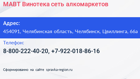 МАВТ-Винотека, сеть алкомаркетов по адресу 454091, Челябинская область, Челябинск, Цвиллинга, 66а в дальнейшем Организация, размещена в следующих категориях: