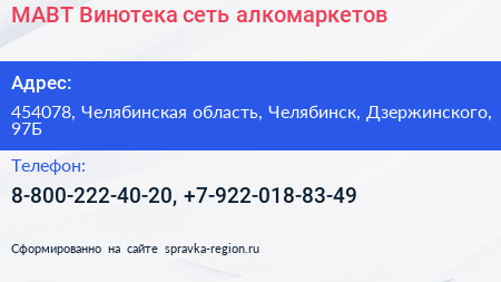 МАВТ-Винотека, сеть алкомаркетов по адресу 454078, Челябинская область, Челябинск, Дзержинского, 97Б в дальнейшем Организация, размещена в следующих категориях: