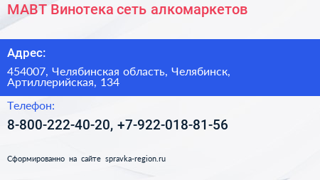 МАВТ-Винотека, сеть алкомаркетов по адресу 454007, Челябинская область, Челябинск, Артиллерийская, 134 в дальнейшем Организация, размещена в следующих категориях: