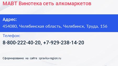 МАВТ-Винотека, сеть алкомаркетов по адресу 454080, Челябинская область, Челябинск, Труда, 156 в дальнейшем Организация, размещена в следующих категориях: