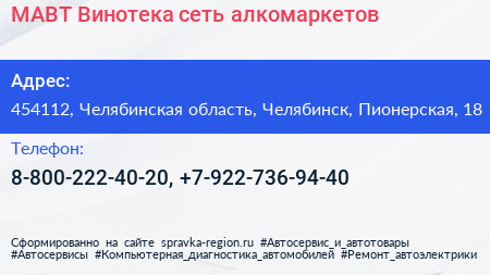 МАВТ-Винотека, сеть алкомаркетов по адресу 454112, Челябинская область, Челябинск, Пионерская, 18 в дальнейшем Организация, размещена в следующих категориях: