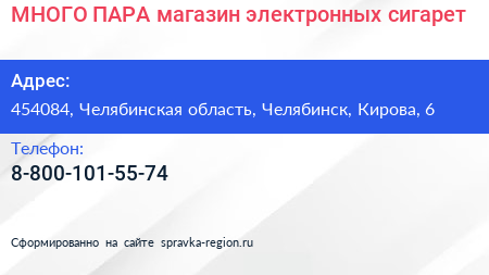 МНОГО ПАРА, магазин электронных сигарет по адресу 454084, Челябинская область, Челябинск, Кирова, 6 в дальнейшем Организация, размещена в следующих категориях: