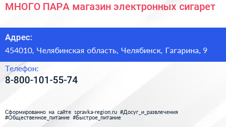 МНОГО ПАРА, магазин электронных сигарет по адресу 454010, Челябинская область, Челябинск, Гагарина, 9 в дальнейшем Организация, размещена в следующих категориях: