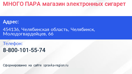 МНОГО ПАРА, магазин электронных сигарет по адресу 454136, Челябинская область, Челябинск, Молодогвардейцев, 66 в дальнейшем Организация, размещена в следующих категориях: