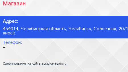 Магазин по адресу 454014, Челябинская область, Челябинск, Солнечная, 20/1 киоск в дальнейшем Организация, размещена в следующих категориях: