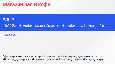 Магазин чая и кофе по адресу 456625, Челябинская область, Челябинск, Гольца, 16 в дальнейшем Организация, размещена в следующих категориях: