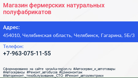 Магазин фермерских натуральных полуфабрикатов по адресу 454010, Челябинская область, Челябинск, Гагарина, 5Б/3 в дальнейшем Организация, размещена в следующих категориях: