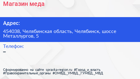 Магазин меда по адресу 454038, Челябинская область, Челябинск, шоссе Металлургов, 5 в дальнейшем Организация, размещена в следующих категориях: