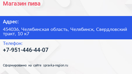 Магазин пива по адресу 454036, Челябинская область, Челябинск, Свердловский тракт, 10 к7 в дальнейшем Организация, размещена в следующих категориях: