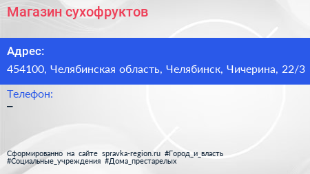 Магазин сухофруктов по адресу 454100, Челябинская область, Челябинск, Чичерина, 22/3 в дальнейшем Организация, размещена в следующих категориях: