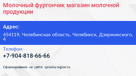 Молочный фургончик, магазин молочной продукции по адресу 454119, Челябинская область, Челябинск, Дзержинского, 4 в дальнейшем Организация, размещена в следующих категориях: