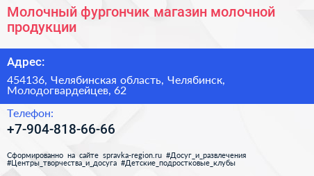 Молочный фургончик, магазин молочной продукции по адресу 454136, Челябинская область, Челябинск, Молодогвардейцев, 62 в дальнейшем Организация, размещена в следующих категориях: