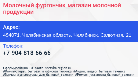 Молочный фургончик, магазин молочной продукции по адресу 454071, Челябинская область, Челябинск, Салютная, 21 в дальнейшем Организация, размещена в следующих категориях: