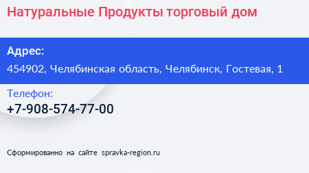 Натуральные Продукты, торговый дом по адресу 454902, Челябинская область, Челябинск, Гостевая, 1 в дальнейшем Организация, размещена в следующих категориях: