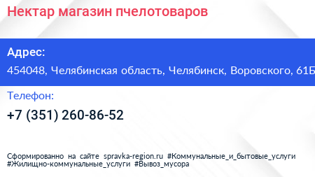 Нектар, магазин пчелотоваров по адресу 454048, Челябинская область, Челябинск, Воровского, 61Б в дальнейшем Организация, размещена в следующих категориях: