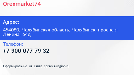 Orexmarket74 по адресу 454080, Челябинская область, Челябинск, проспект Ленина, 64д в дальнейшем Организация, размещена в следующих категориях: