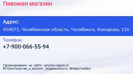 Пивоман, магазин по адресу 454071, Челябинская область, Челябинск, Комарова, 116 в дальнейшем Организация, размещена в следующих категориях: