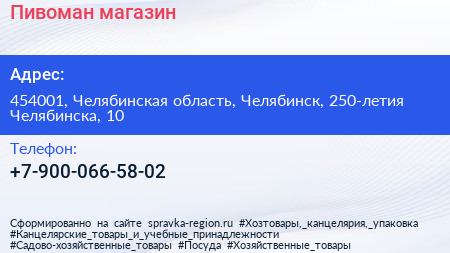 Пивоман, магазин по адресу 454001, Челябинская область, Челябинск, 250-летия Челябинска, 10 в дальнейшем Организация, размещена в следующих категориях: