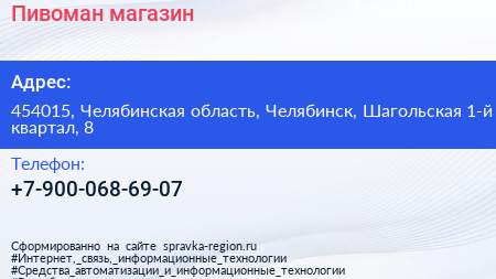 Пивоман, магазин по адресу 454015, Челябинская область, Челябинск, Шагольская 1-й квартал, 8 в дальнейшем Организация, размещена в следующих категориях:
