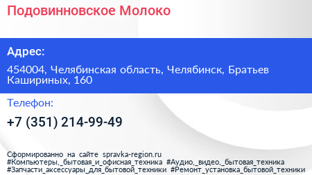 Подовинновское Молоко по адресу 454004, Челябинская область, Челябинск, Братьев Кашириных, 160 в дальнейшем Организация, размещена в следующих категориях:
