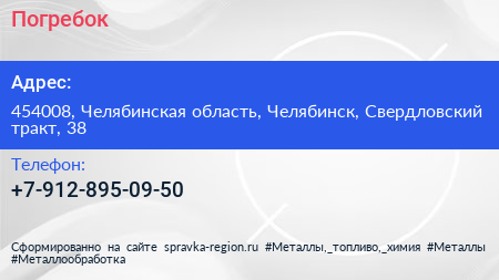 Погребок по адресу 454008, Челябинская область, Челябинск, Свердловский тракт, 38 в дальнейшем Организация, размещена в следующих категориях: