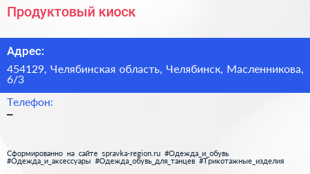 Продуктовый киоск по адресу 454129, Челябинская область, Челябинск, Масленникова, 6/3 в дальнейшем Организация, размещена в следующих категориях: