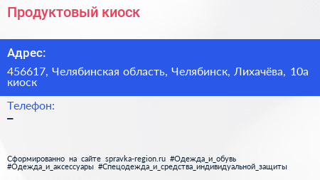 Продуктовый киоск по адресу 456617, Челябинская область, Челябинск, Лихачёва, 10а киоск в дальнейшем Организация, размещена в следующих категориях: