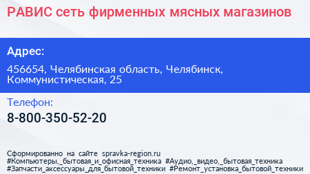 РАВИС, сеть фирменных мясных магазинов по адресу 456654, Челябинская область, Челябинск, Коммунистическая, 25 в дальнейшем Организация, размещена в следующих категориях: