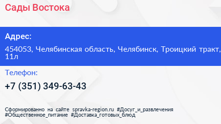 Сады Востока по адресу 454053, Челябинская область, Челябинск, Троицкий тракт, 11л в дальнейшем Организация, размещена в следующих категориях:
