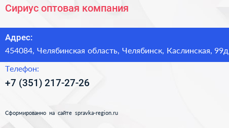 Сириус, оптовая компания по адресу 454084, Челябинская область, Челябинск, Каслинская, 99д в дальнейшем Организация, размещена в следующих категориях: