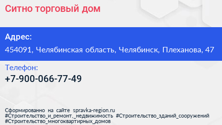 Ситно, торговый дом по адресу 454091, Челябинская область, Челябинск, Плеханова, 47 в дальнейшем Организация, размещена в следующих категориях: