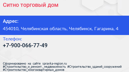 Ситно, торговый дом по адресу 454010, Челябинская область, Челябинск, Гагарина, 4 в дальнейшем Организация, размещена в следующих категориях: