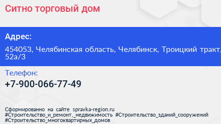 Ситно, торговый дом по адресу 454053, Челябинская область, Челябинск, Троицкий тракт, 52а/3 в дальнейшем Организация, размещена в следующих категориях:
