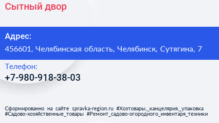 Сытный двор по адресу 456601, Челябинская область, Челябинск, Сутягина, 7 в дальнейшем Организация, размещена в следующих категориях: