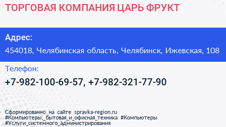 ТОРГОВАЯ КОМПАНИЯ ЦАРЬ ФРУКТ по адресу 454018, Челябинская область, Челябинск, Ижевская, 108 в дальнейшем Организация, размещена в следующих категориях: