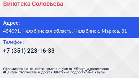Винотека Соловьева по адресу 454091, Челябинская область, Челябинск, Маркса, 81 в дальнейшем Организация, размещена в следующих категориях: