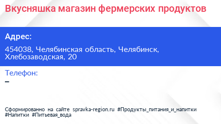 Вкусняшка, магазин фермерских продуктов по адресу 454038, Челябинская область, Челябинск, Хлебозаводская, 20 в дальнейшем Организация, размещена в следующих категориях: