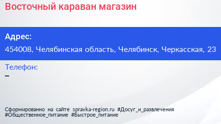 Восточный караван, магазин по адресу 454008, Челябинская область, Челябинск, Черкасская, 23 в дальнейшем Организация, размещена в следующих категориях: