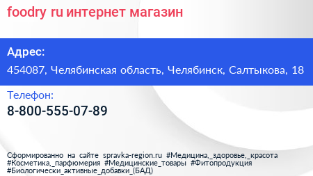 foodry.ru, интернет-магазин по адресу 454087, Челябинская область, Челябинск, Салтыкова, 18 в дальнейшем Организация, размещена в следующих категориях: