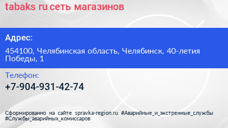 tabaks.ru, сеть магазинов по адресу 454100, Челябинская область, Челябинск, 40-летия Победы, 1 в дальнейшем Организация, размещена в следующих категориях: