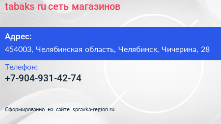 tabaks.ru, сеть магазинов по адресу 454003, Челябинская область, Челябинск, Чичерина, 28 в дальнейшем Организация, размещена в следующих категориях: