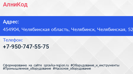 АлниКод по адресу 454904, Челябинская область, Челябинск, Челябинская, 52 в дальнейшем Организация, размещена в следующих категориях: