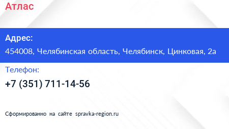 Атлас по адресу 454008, Челябинская область, Челябинск, Цинковая, 2а в дальнейшем Организация, размещена в следующих категориях: