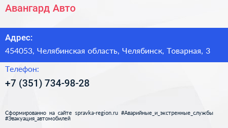 Авангард-Авто по адресу 454053, Челябинская область, Челябинск, Товарная, 3 в дальнейшем Организация, размещена в следующих категориях: