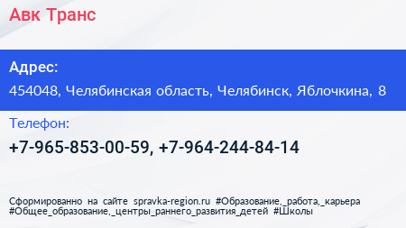 Авк Транс по адресу 454048, Челябинская область, Челябинск, Яблочкина, 8 в дальнейшем Организация, размещена в следующих категориях: