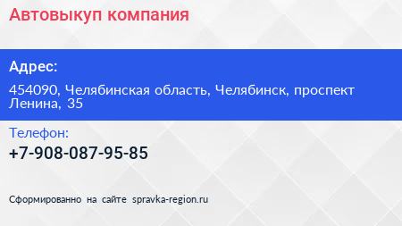 Автовыкуп, компания по адресу 454090, Челябинская область, Челябинск, проспект Ленина, 35 в дальнейшем Организация, размещена в следующих категориях: