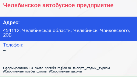 Челябинское автобусное предприятие по адресу 454112, Челябинская область, Челябинск, Чайковского, 20Б в дальнейшем Организация, размещена в следующих категориях: